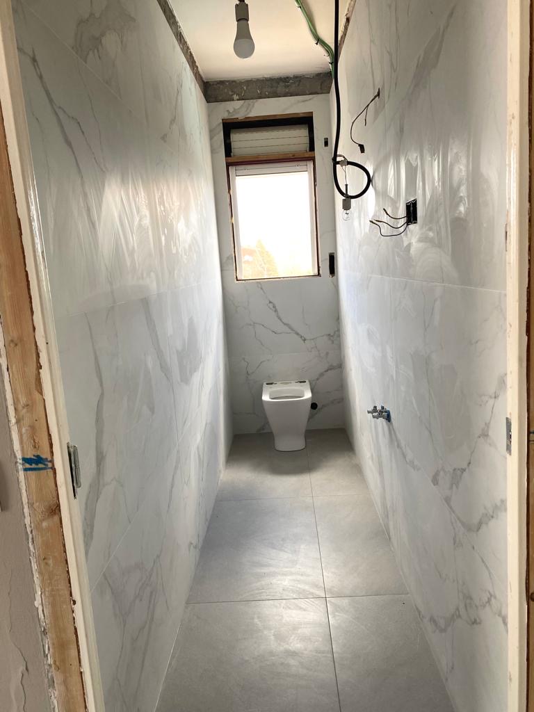 Las paredes se revistieron con cerámica efecto mármol en gran formato (60×120 cm), una elección que aporta continuidad visual y una sensación de amplitud superior al tamaño real del aseo. En el suelo, un porcelánico de 90×90 cm en tono neutro complementa la estética general y aporta equilibrio.