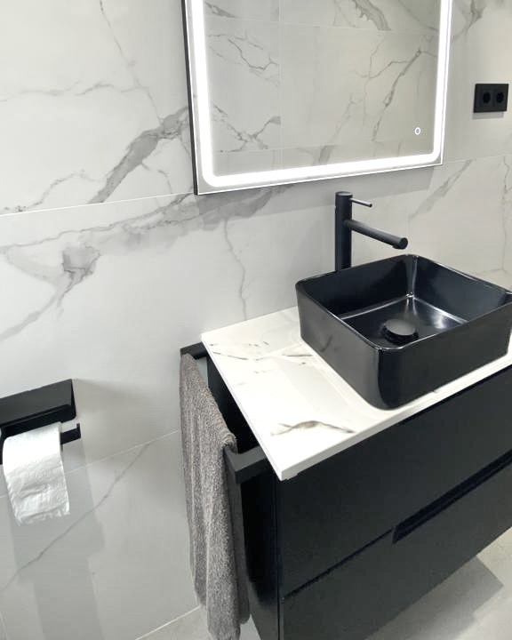 El diseño se completa con un mueble suspendido en negro mate, de fondo reducido, con encimera DektonKairos y lavabo bol rectangular, una combinación que aporta sofisticación y carácter. La grifería negra mate, a juego con el mobiliario, refuerza el contraste con el mármol blanco y se convierte en el punto focal del conjunto.