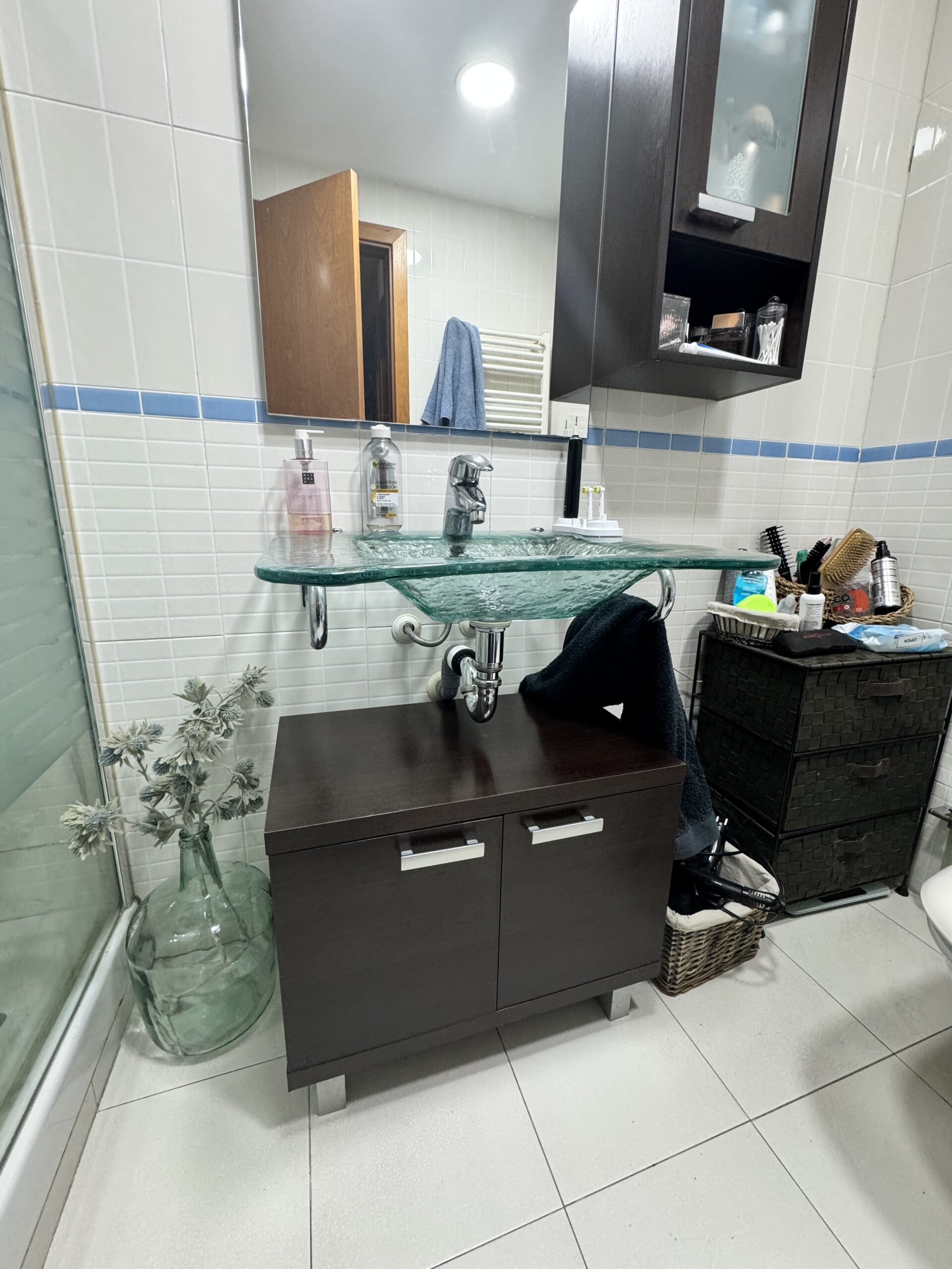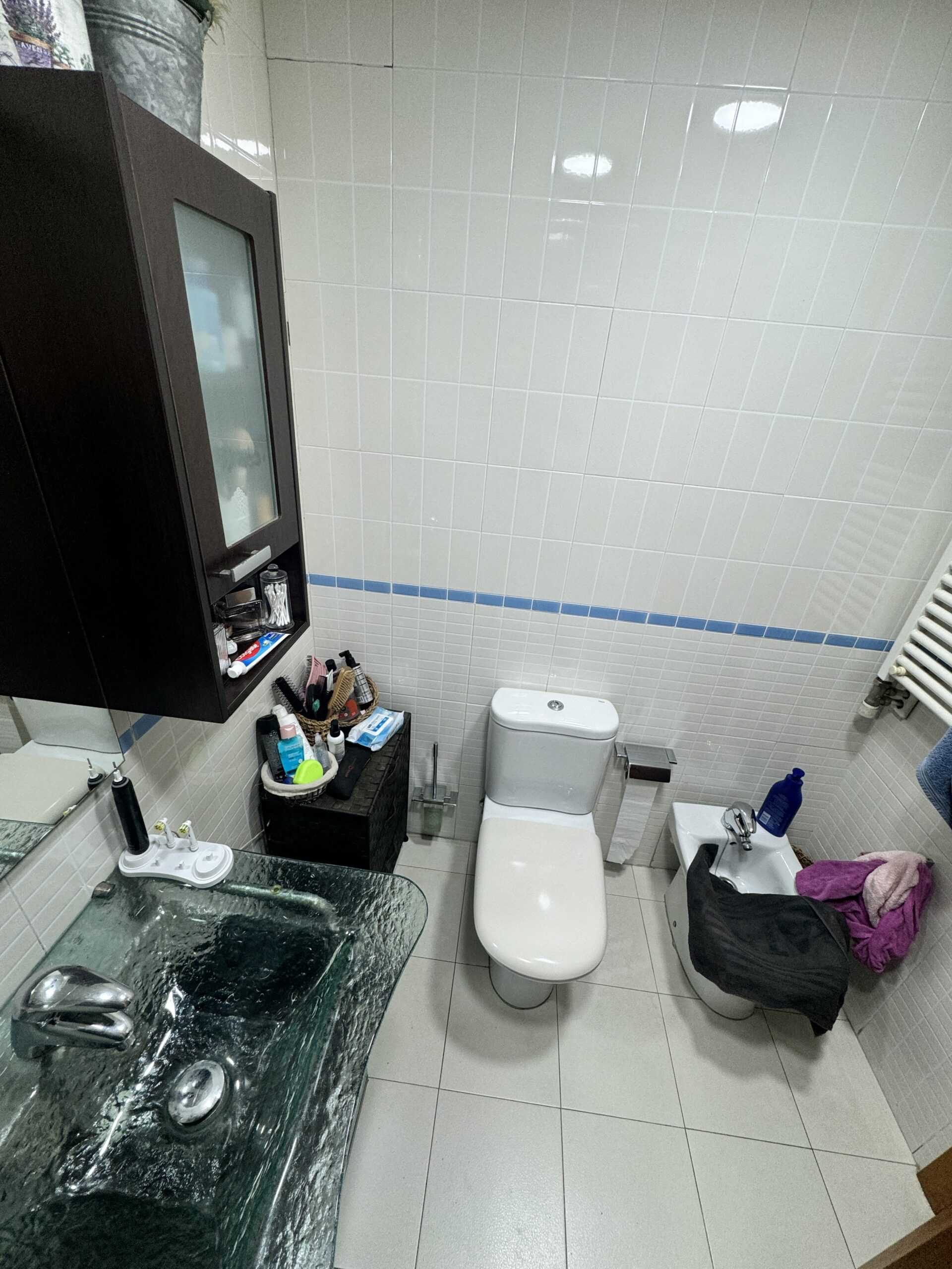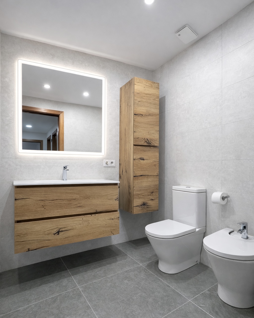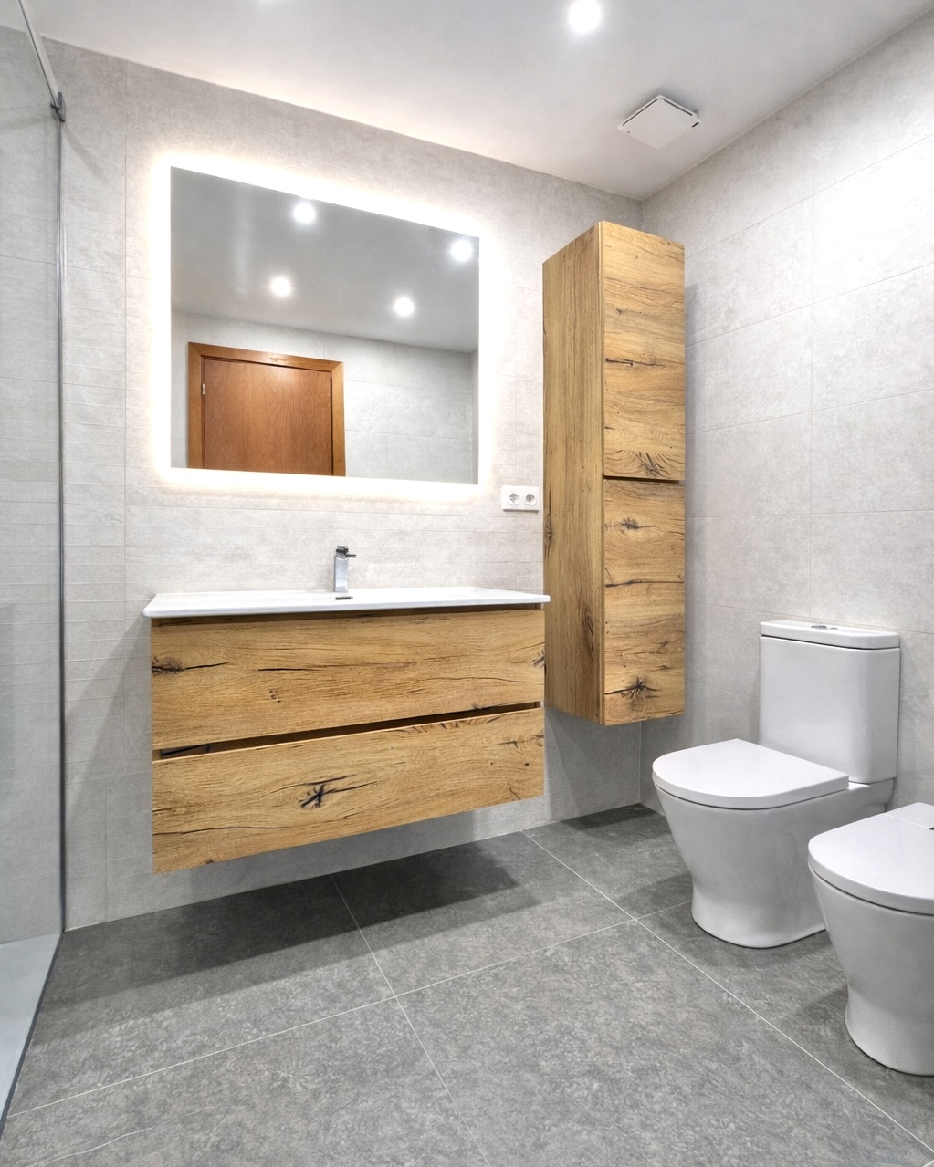 Baño 1: Claridad y almacenamiento En el primer baño, apostamos por un revestimiento cerámico en blanco roto que multiplica la luminosidad. Instalamos un conjunto de mobiliario suspendido en madera natural con lavabo de porcelana, complementado con una columna de almacenamiento a juego para maximizar el orden. El toque tecnológico lo aporta el espejo con luz perimetral, que elimina sombras en el rostro.