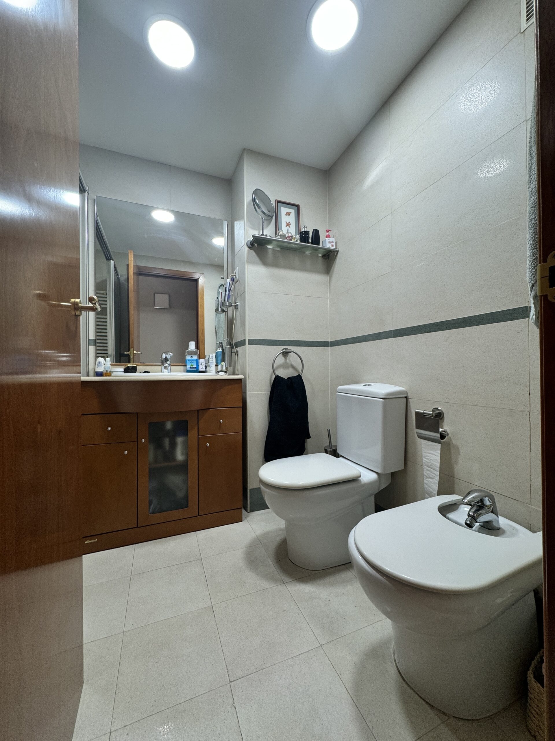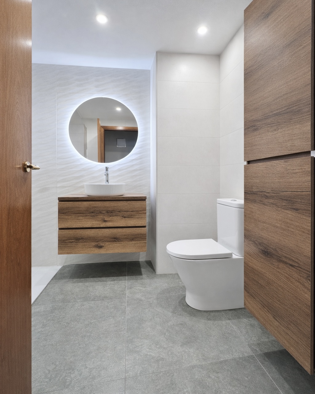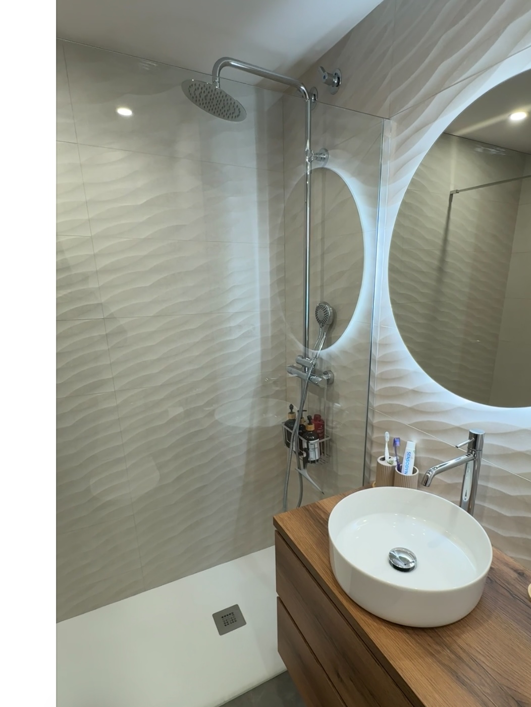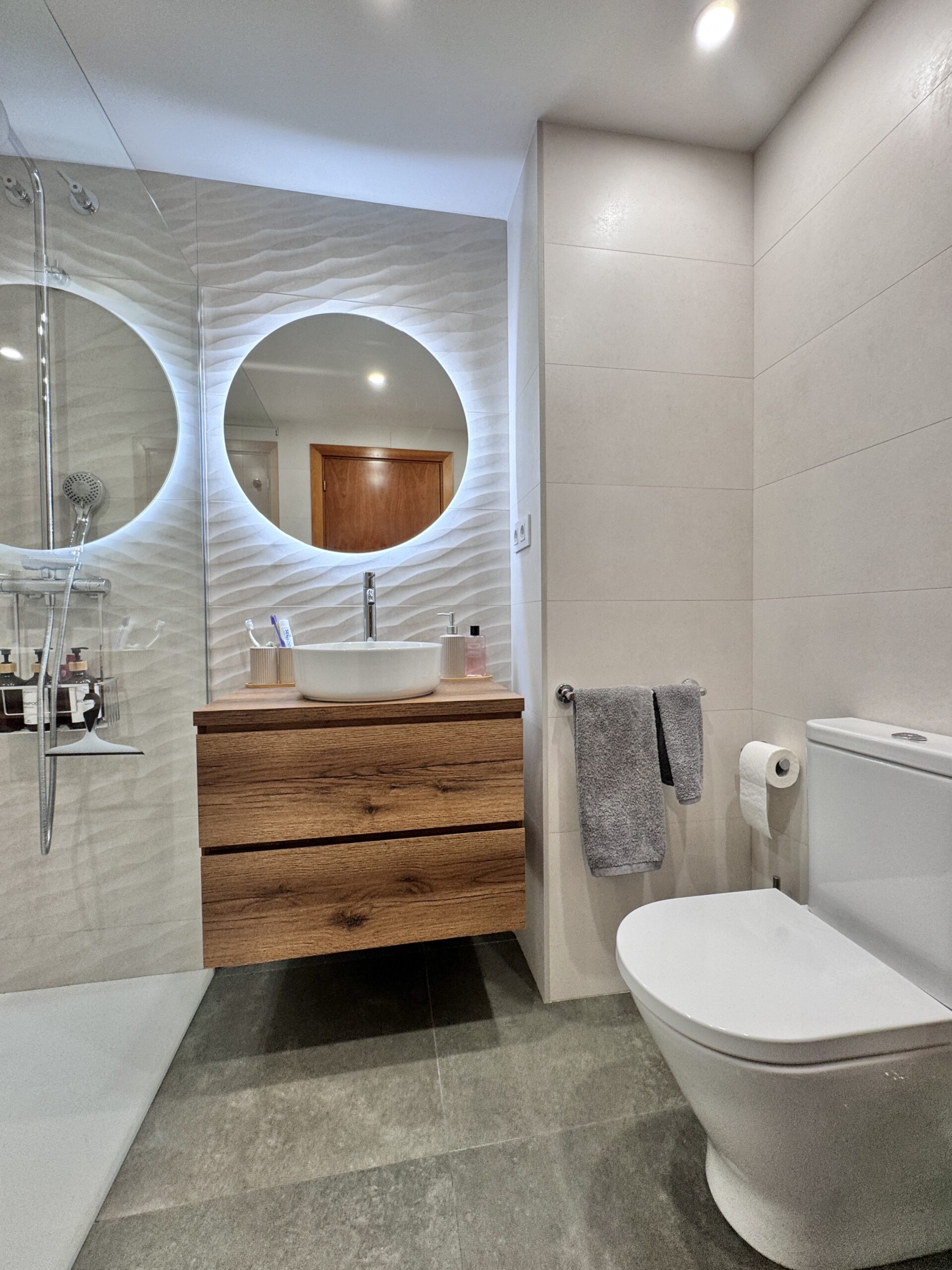 Baño 2: Texturas y diseño circular Para el segundo baño, buscamos una atmósfera más orgánica. Utilizamos cerámica en tonos beige combinada con relieves que aportan volumen y elegancia a las paredes. El mobiliario de madera aquí se corona con una encimera y un bol redondo de porcelana, creando un punto focal moderno que rompe con las líneas rectas tradicionales. El espejo circular retroiluminado cierra un diseño de vanguardia.