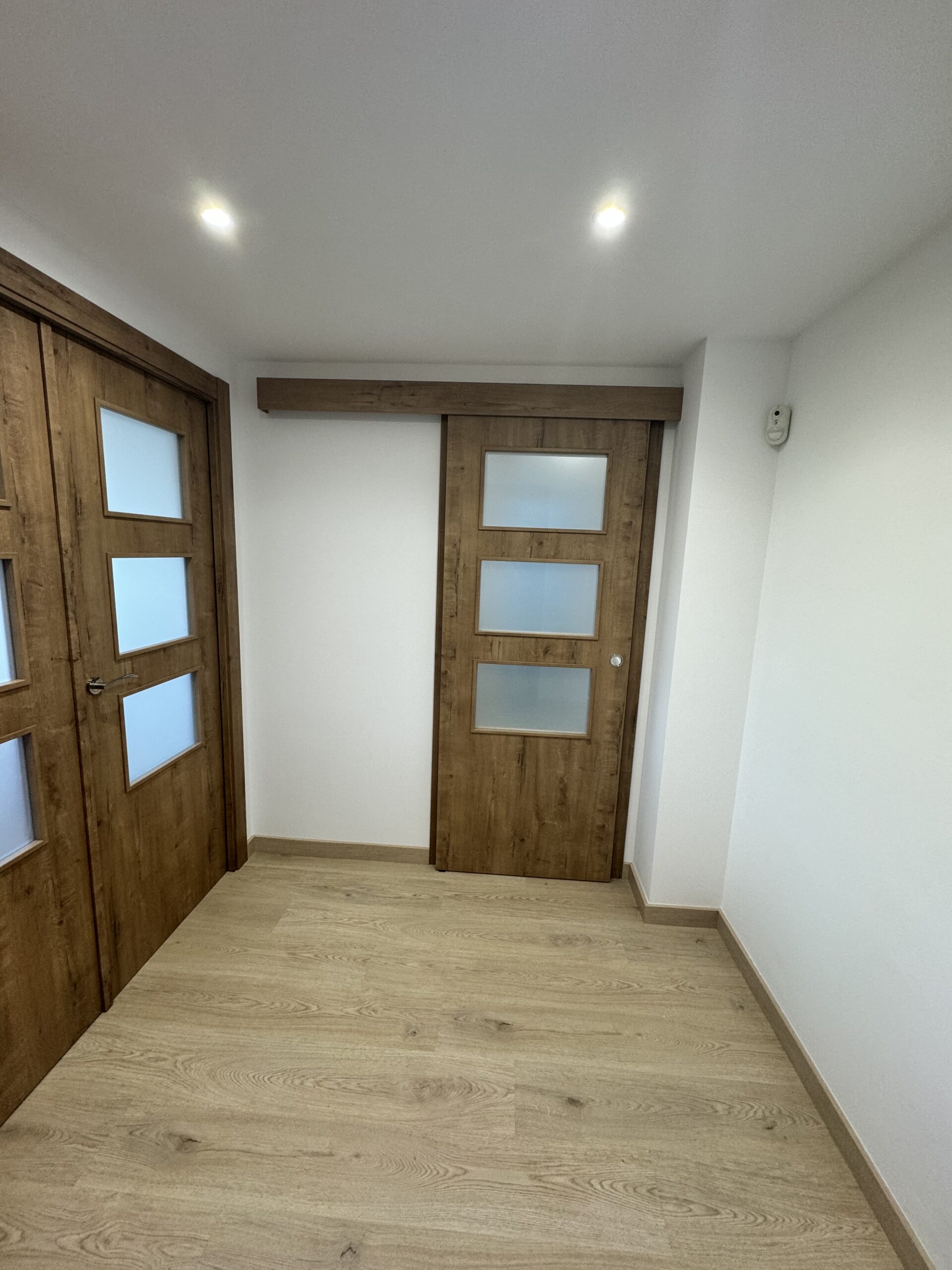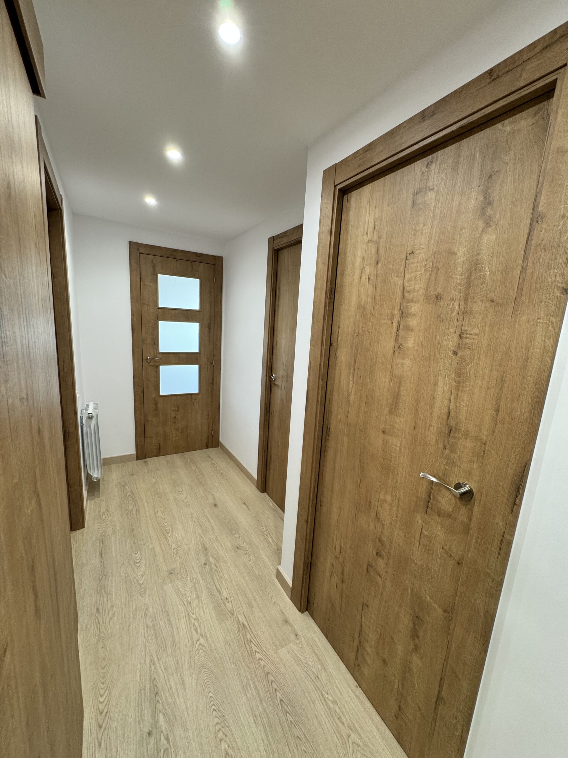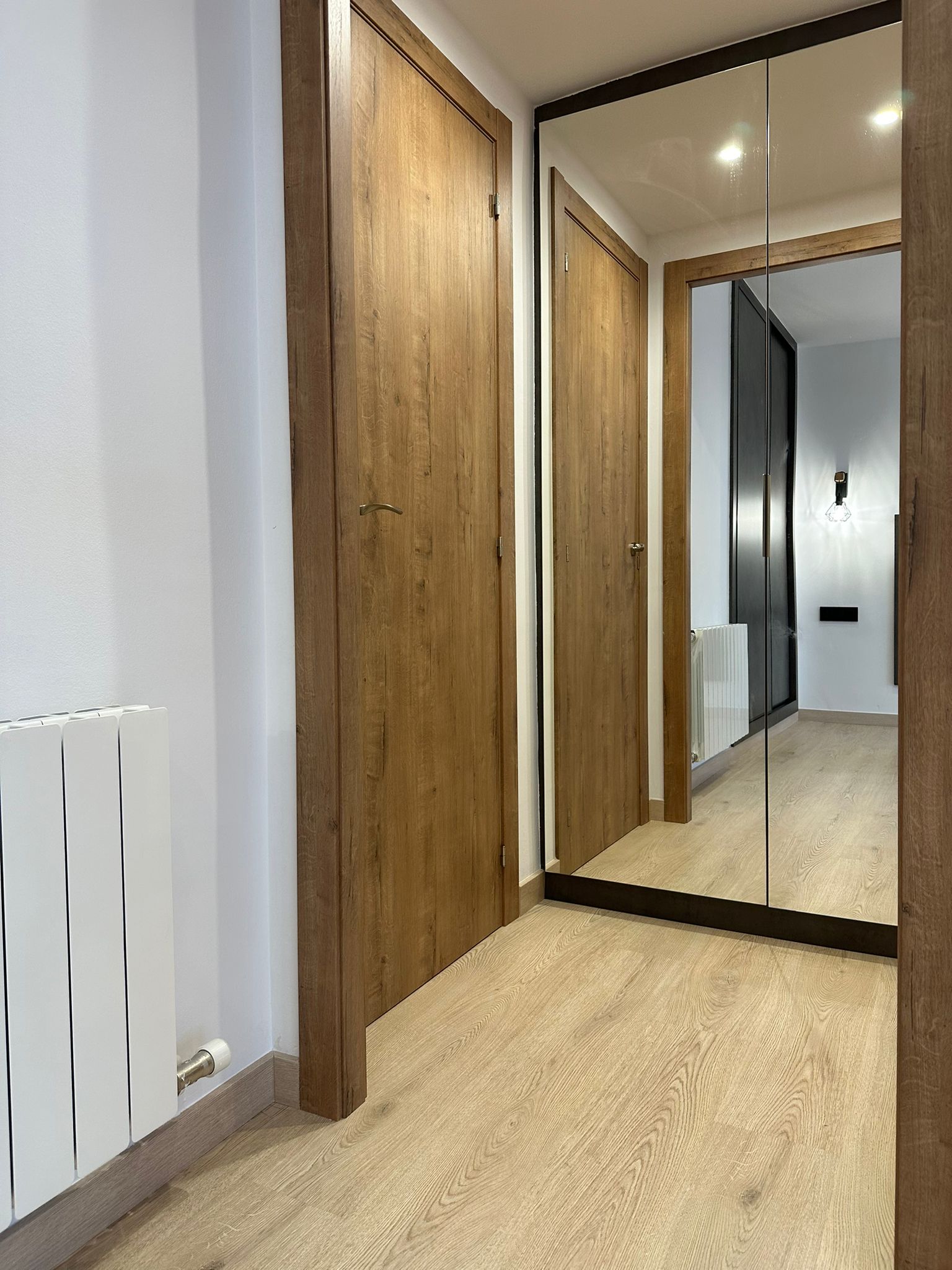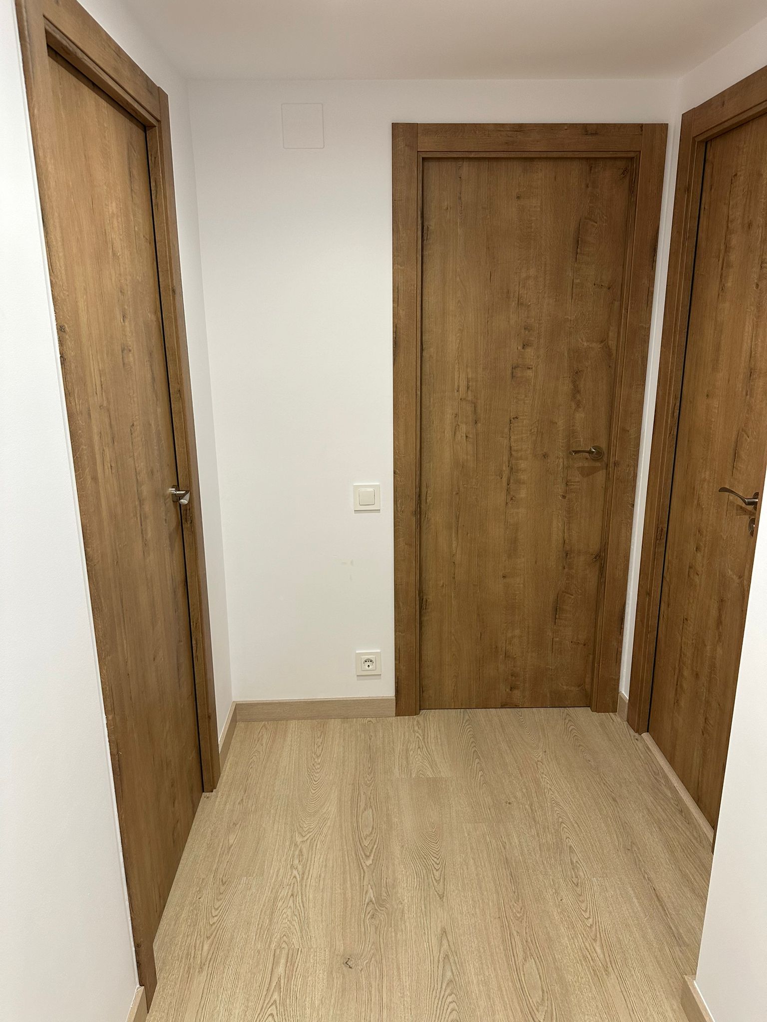 Suelos y Paredes: Instalamos suelo Finfloor Evolve AC6 (máxima resistencia) y puertas de roble Gold, creando una base cálida. Además, alisamos todas las paredes para eliminar el papel antiguo.