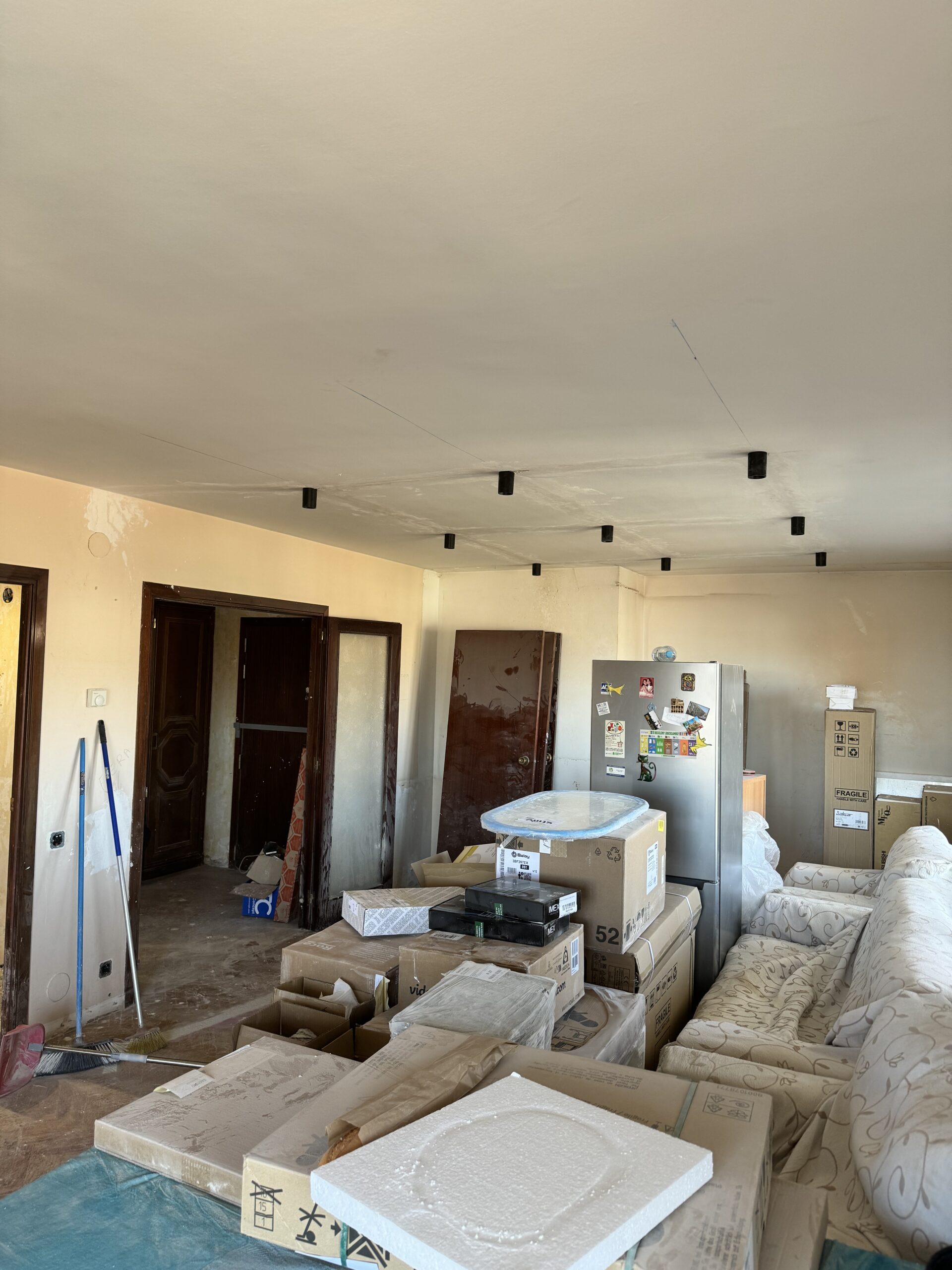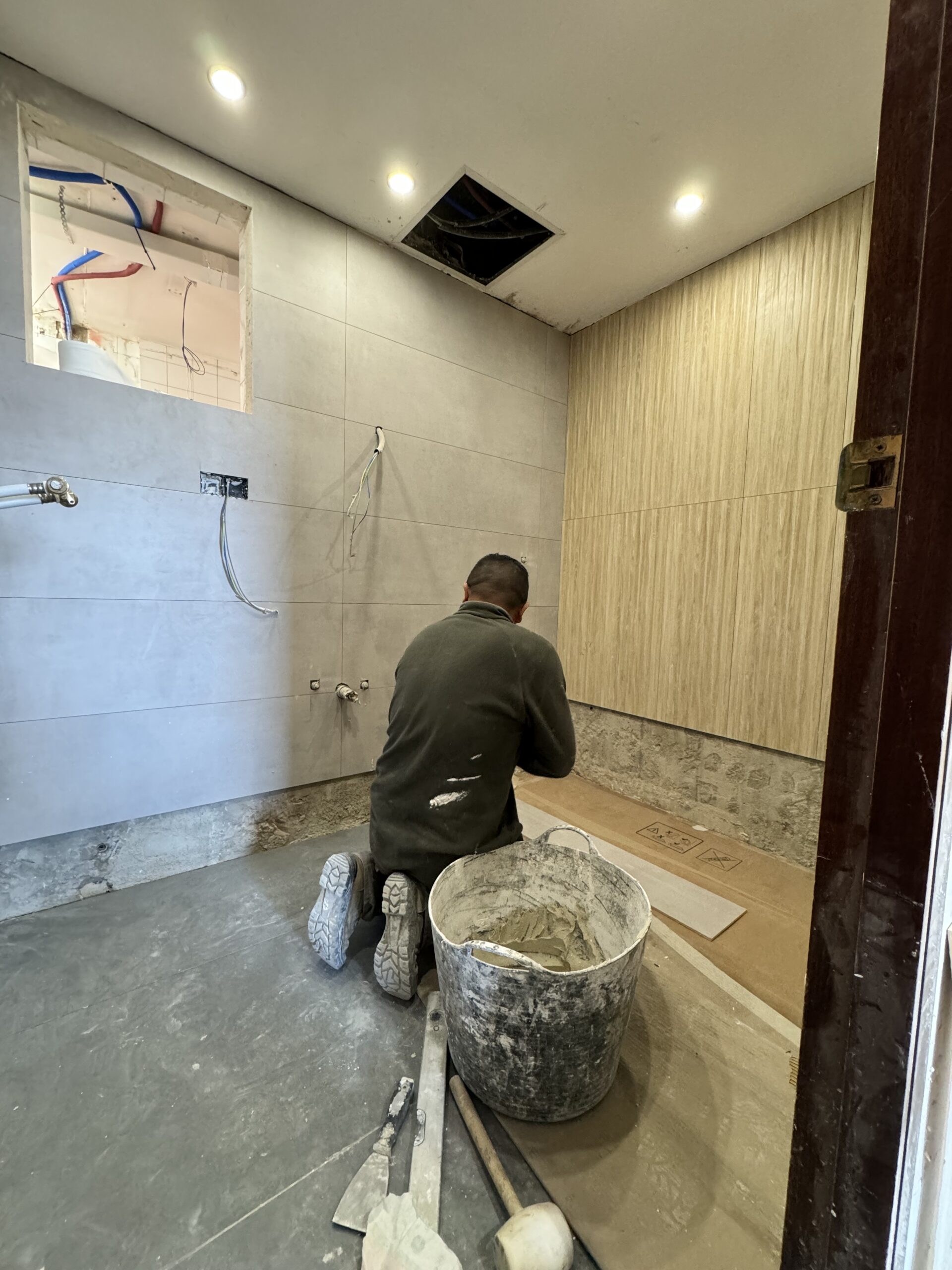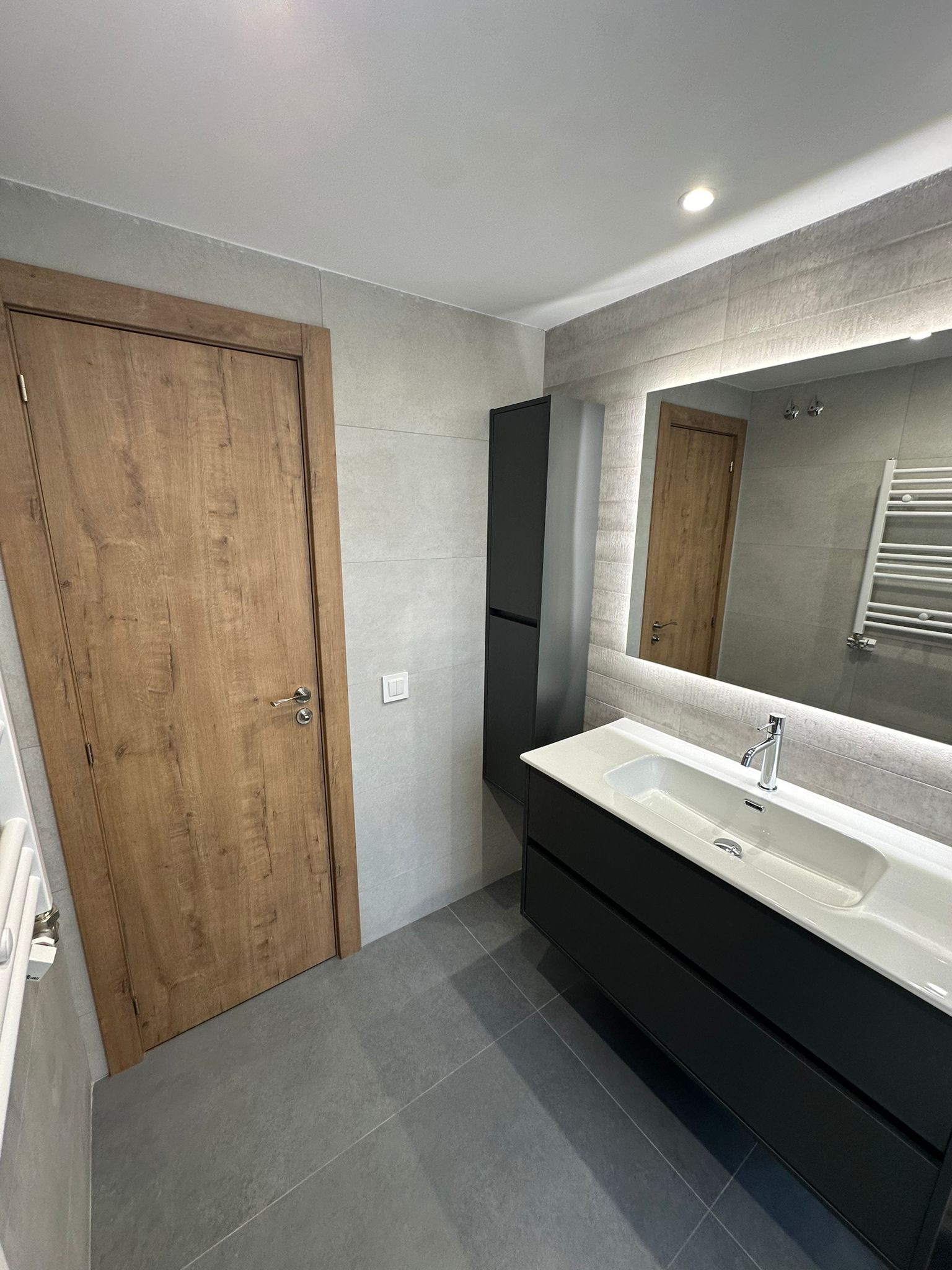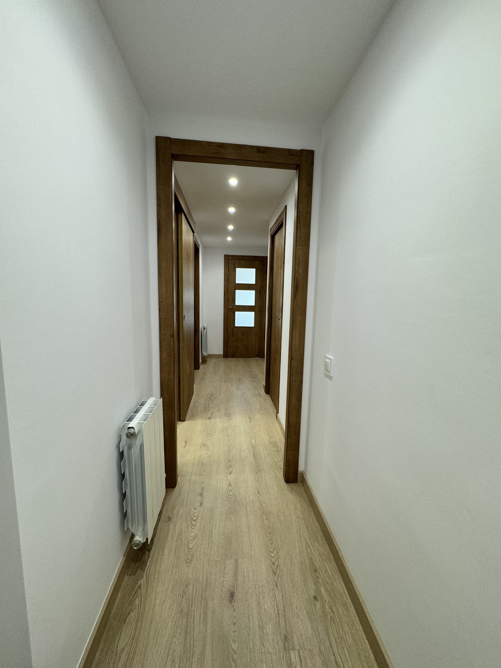 Suelos y Paredes: Instalamos suelo Finfloor Evolve AC6 (máxima resistencia) y puertas de roble Gold, creando una base cálida. Además, alisamos todas las paredes para eliminar el papel antiguo.