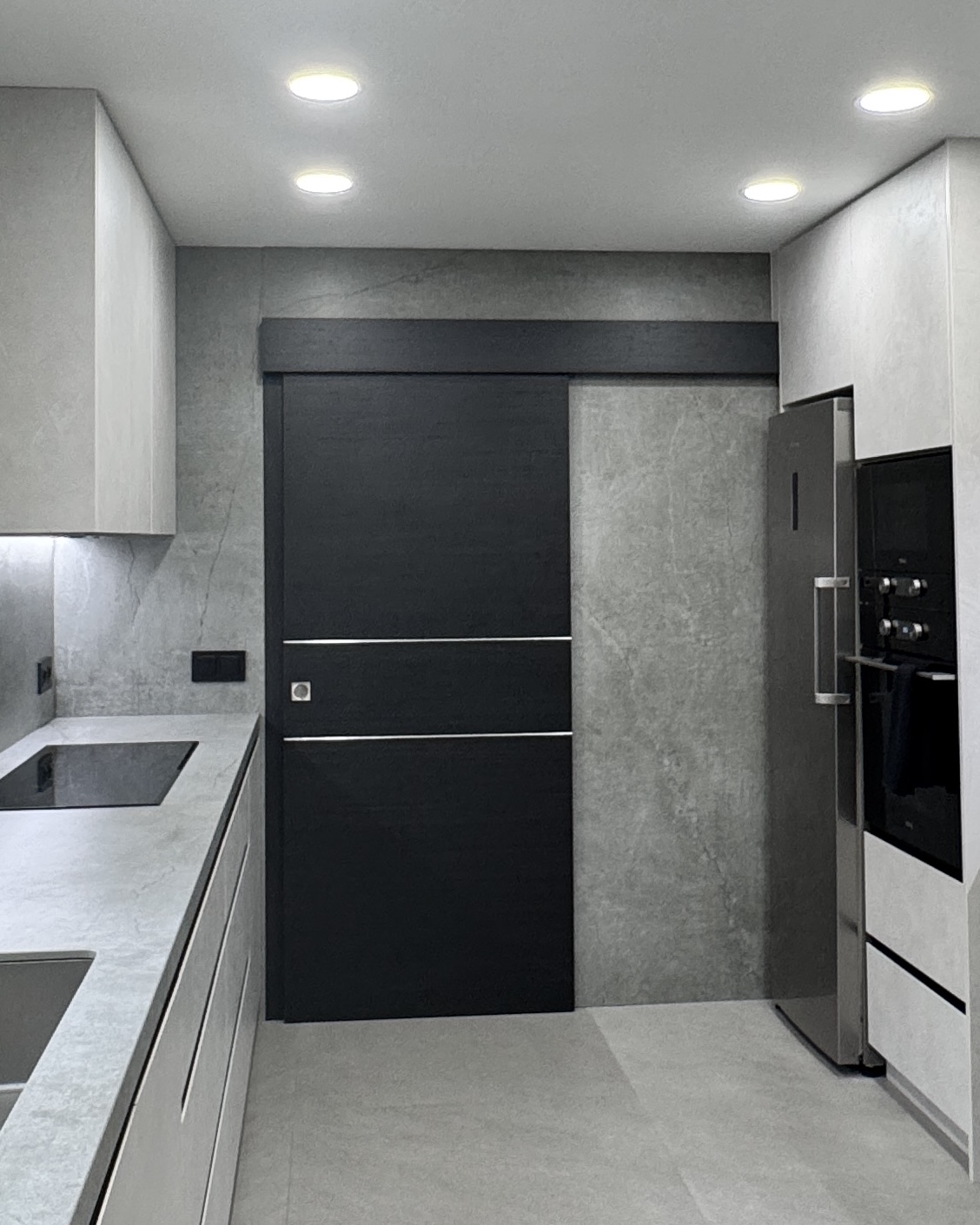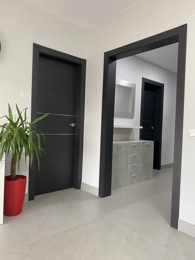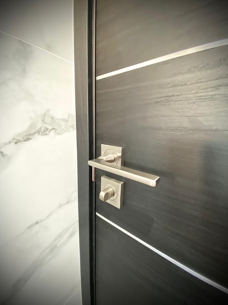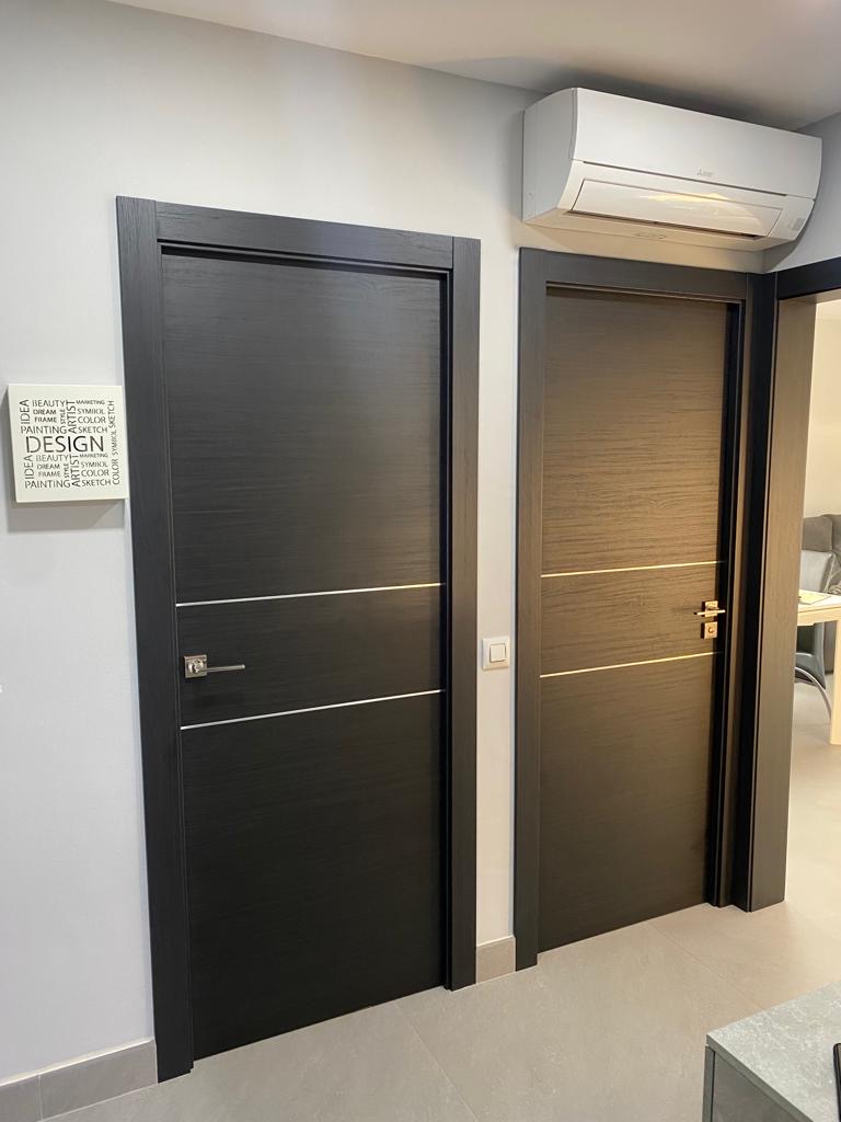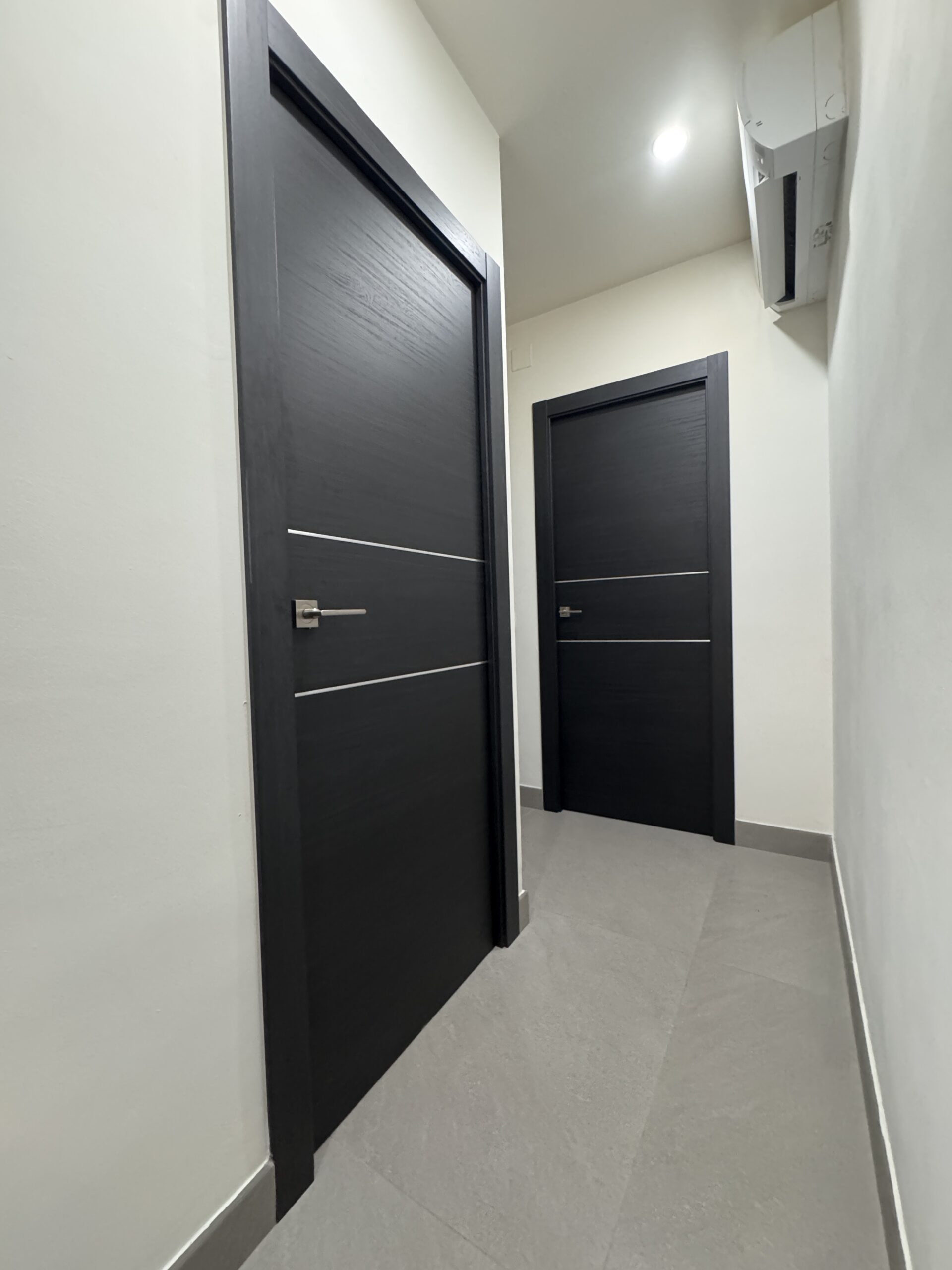 Nuestra intervención comenzó con la planificación de la carpintería técnica. Instalamos puertas laminadas en acabado carbón textur, cuyo detalle de decoración «viva metal» aporta un reflejo contemporáneo muy sutil pero impactante. Para la entrada, optamos por una solución de aluminio bicolor, garantizando seguridad y aislamiento térmico sin romper la armonía visual de la vivienda ni de la comunidad de vecinos.