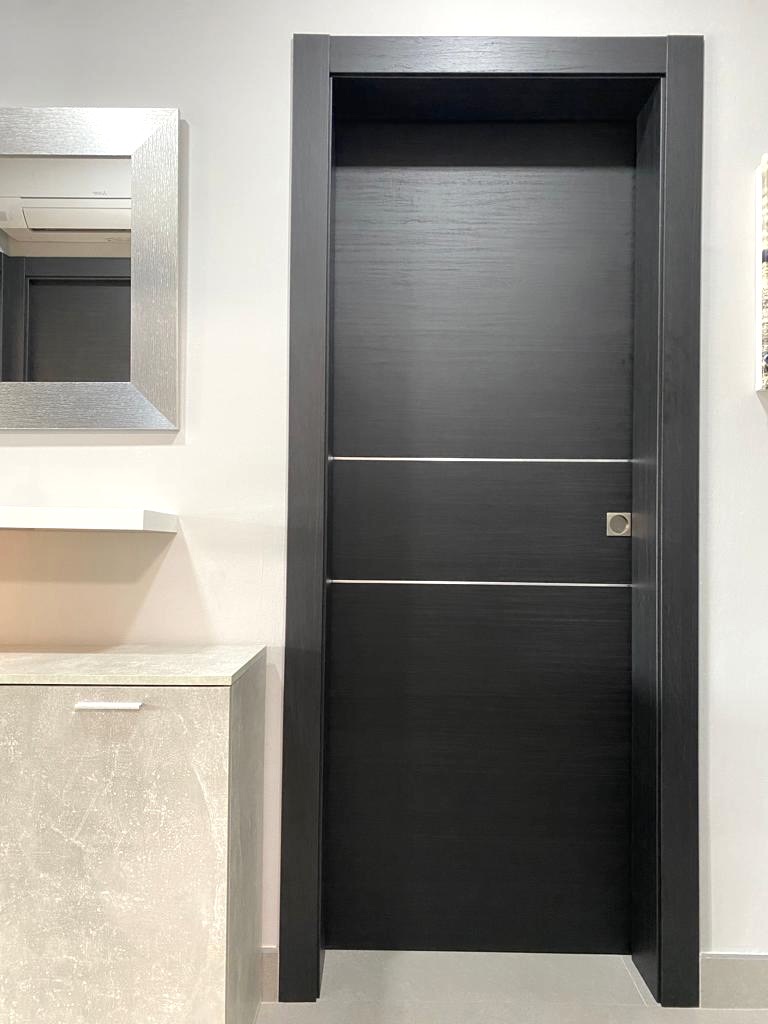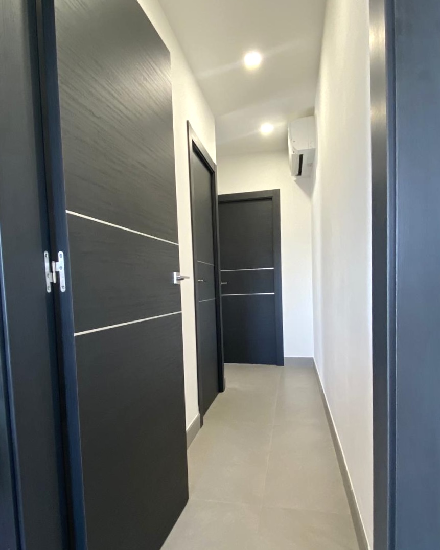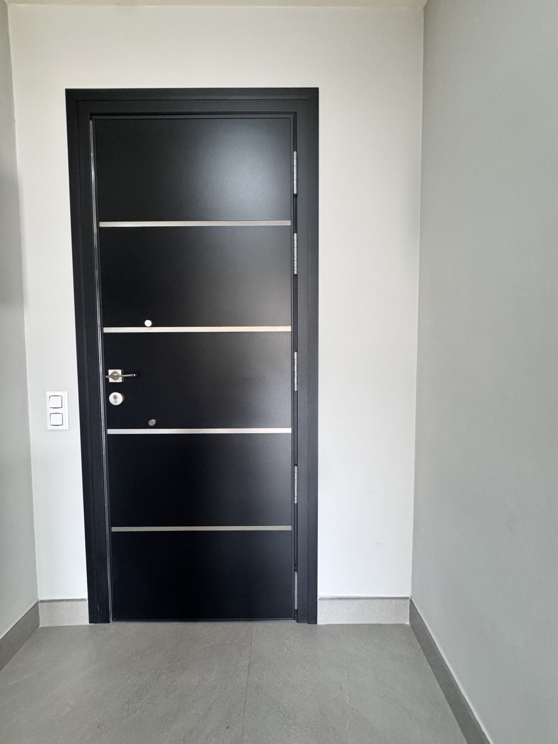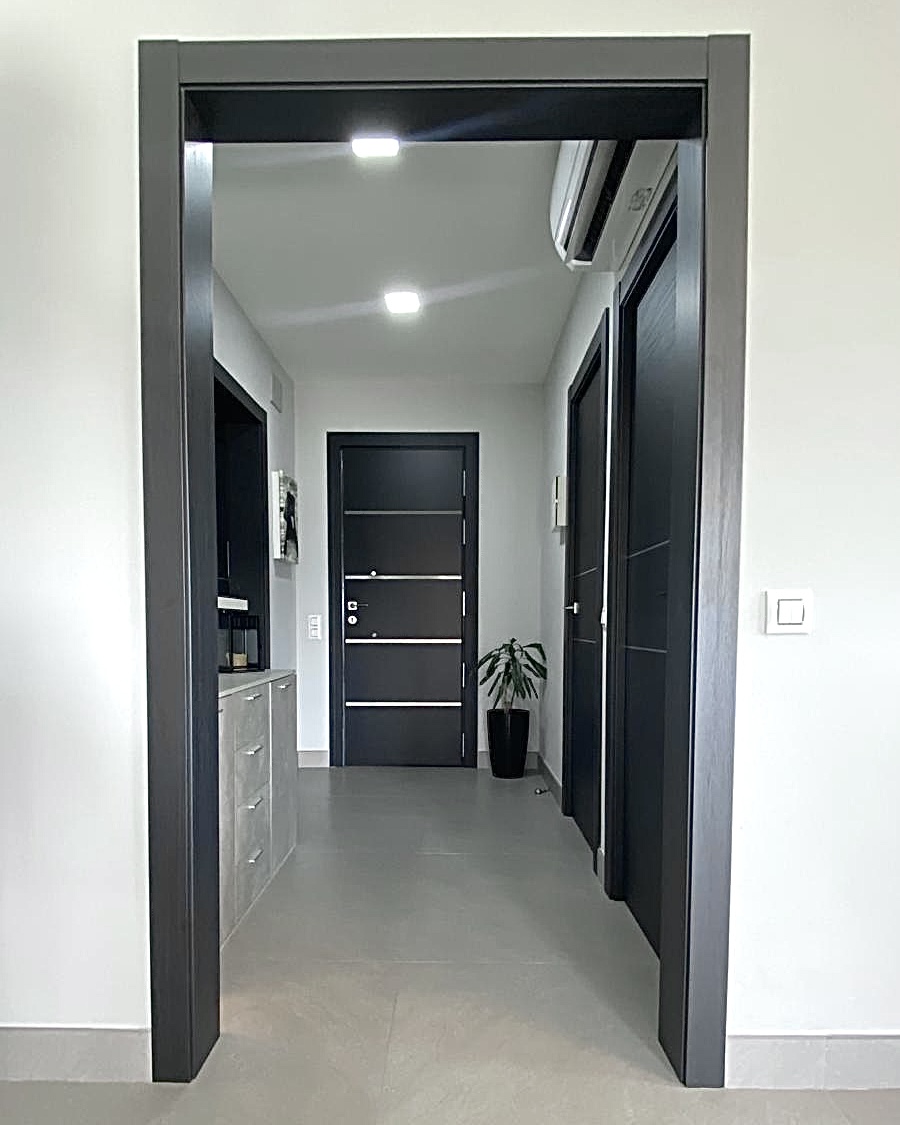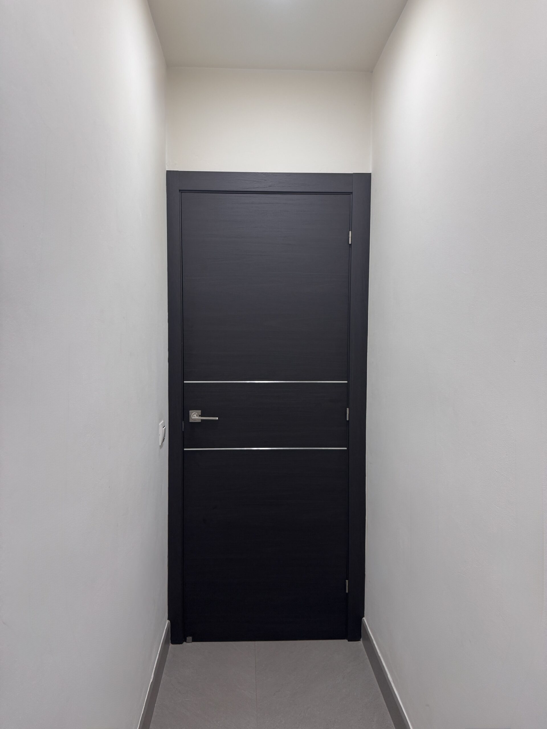 Nuestra intervención comenzó con la planificación de la carpintería técnica. Instalamos puertas laminadas en acabado carbón textur, cuyo detalle de decoración «viva metal» aporta un reflejo contemporáneo muy sutil pero impactante. Para la entrada, optamos por una solución de aluminio bicolor, garantizando seguridad y aislamiento térmico sin romper la armonía visual de la vivienda ni de la comunidad de vecinos.