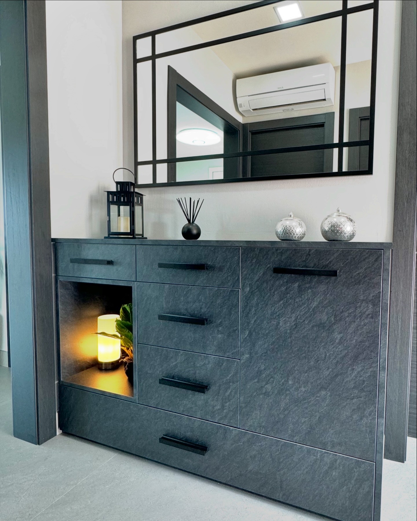 La selección de materiales de Egger marcó la diferencia en este servicio de reformas. En el recibidor, diseñamos un mueble a medida con melamina efecto pizarra piedra, que incluye una hornacina decorativa ideal para romper la robustez del mueble y aportar profundidad. Esta pieza se complementó con una cajonera en melamina gris macan, aportando una textura suave que contrasta con la fuerza de los tiradores negros y el espejo con cuarterones enmarcado, que amplifica la luz natural de la entrada.
