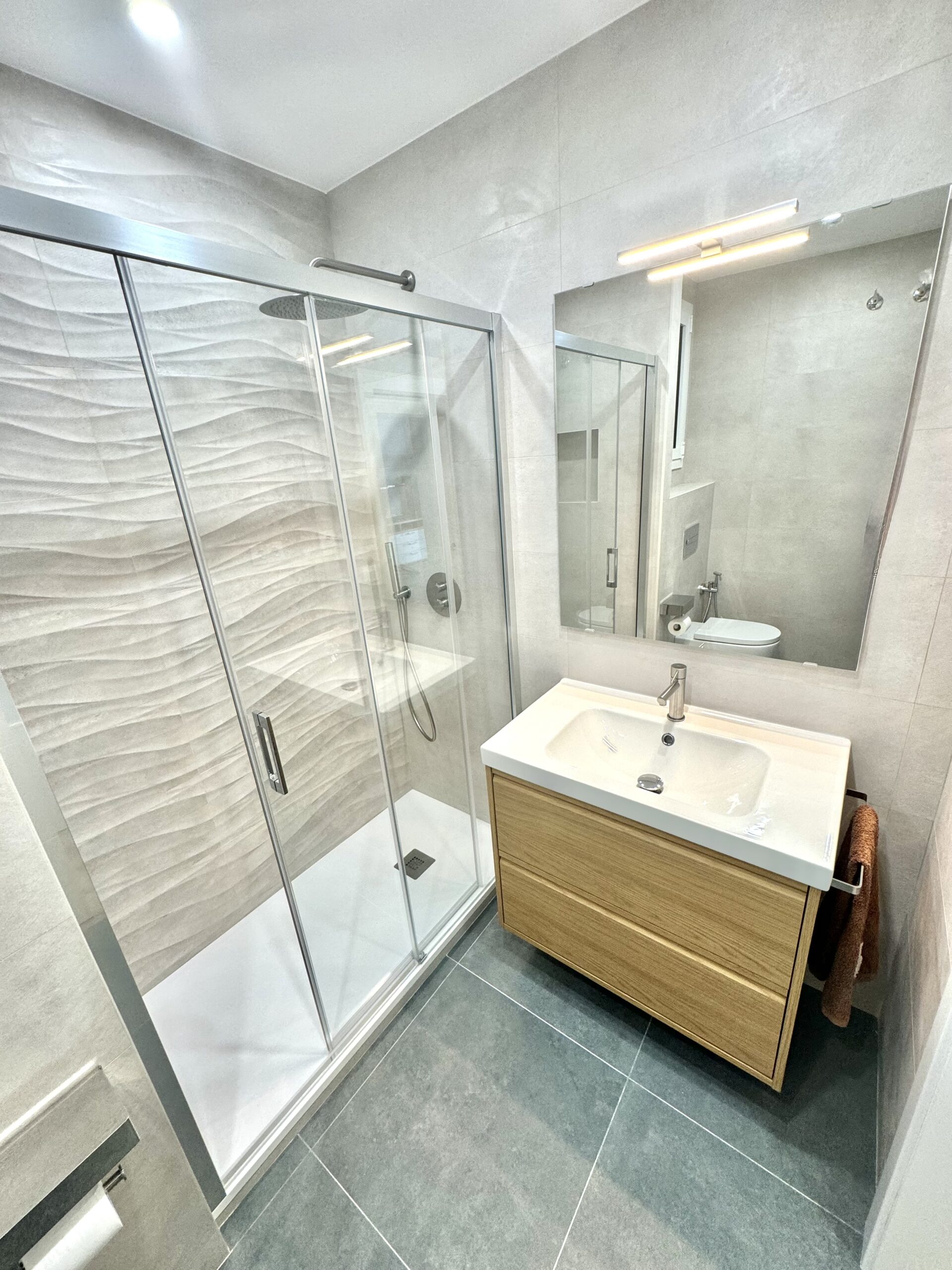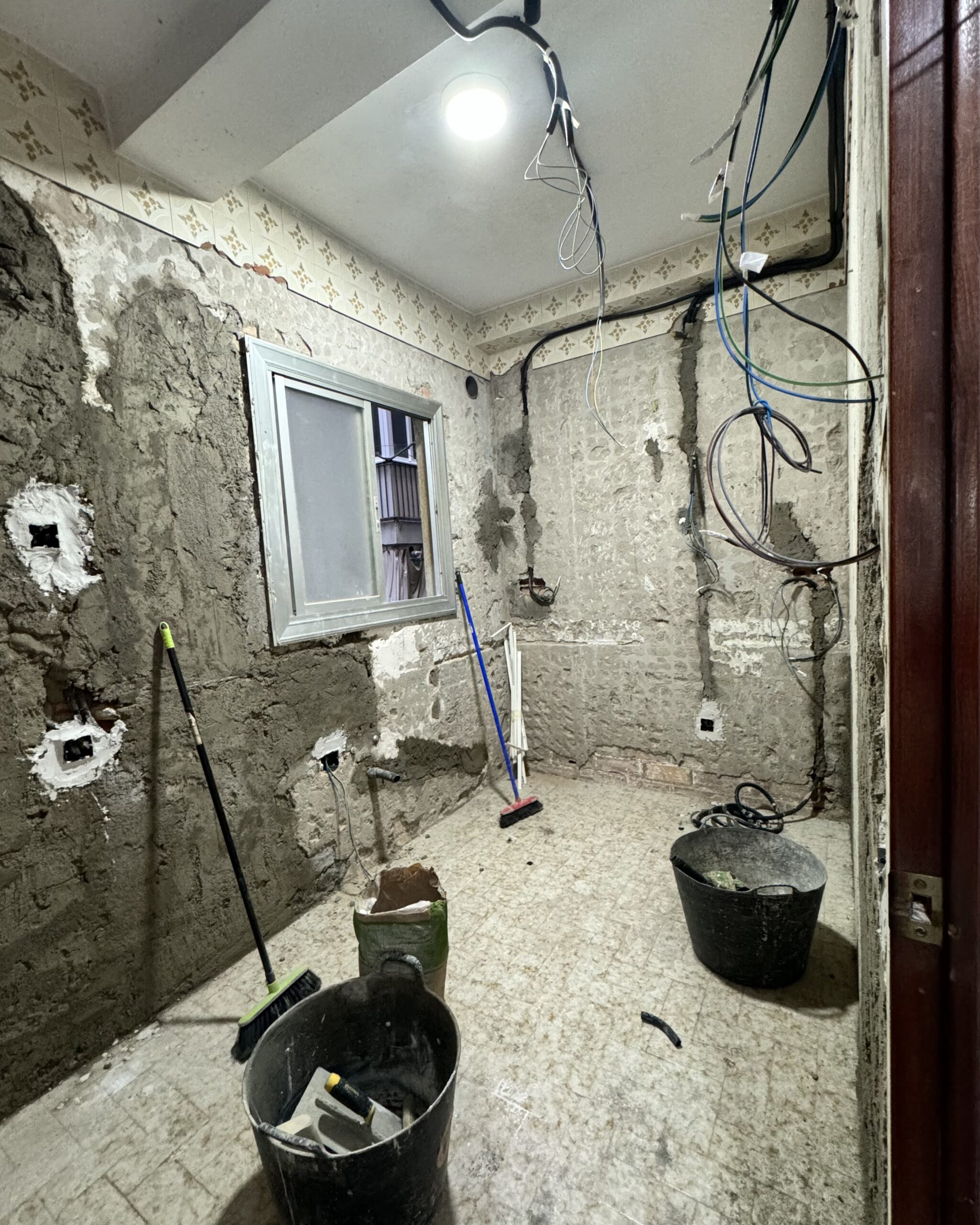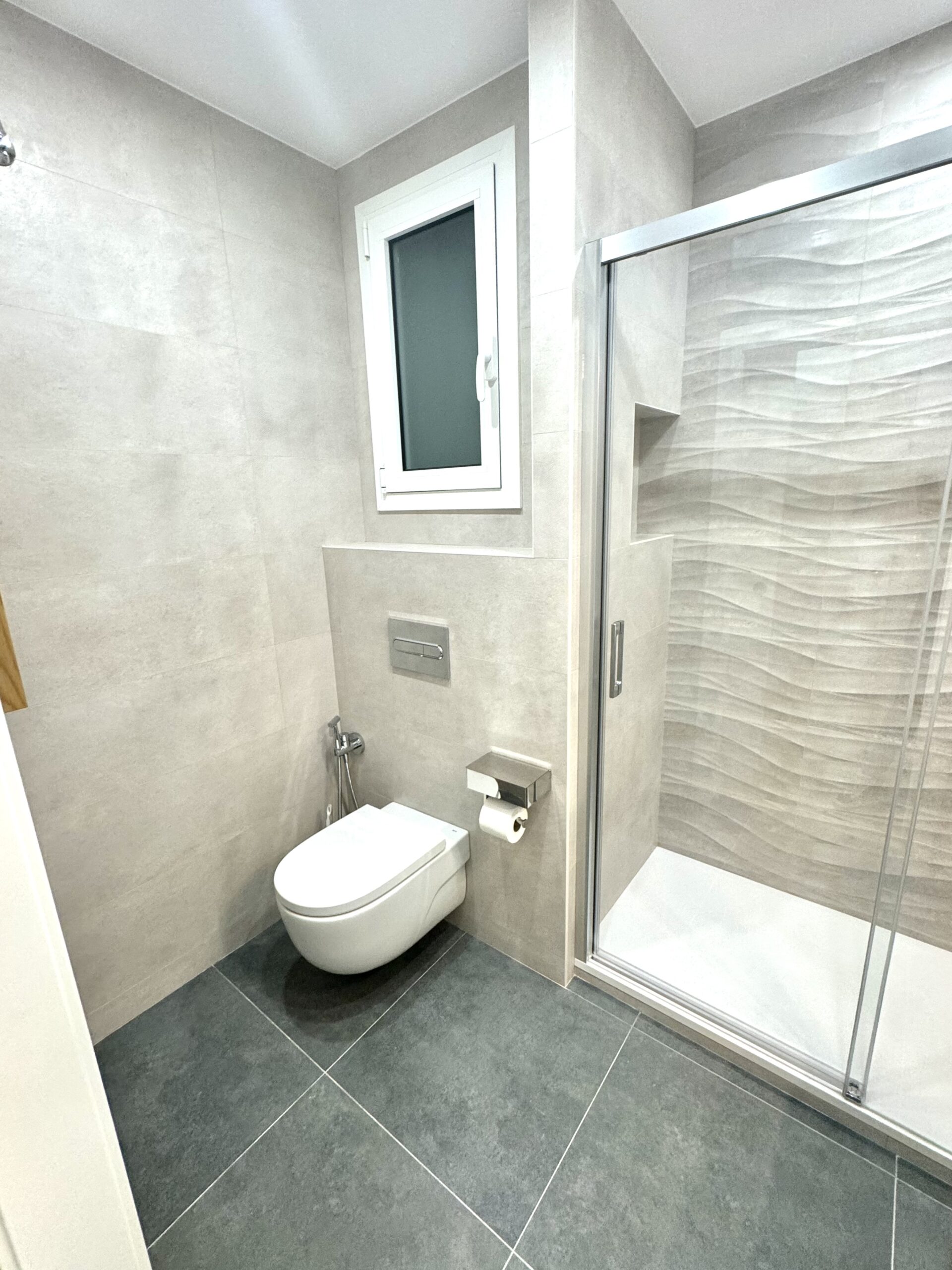 En la cocina, el proceso fue especialmente minucioso. Tras renovar por completo las instalaciones y colocar techos de Pladur, realizamos el cerramiento del antiguo paso al lavadero para optimizar la superficie de trabajo. El baño, por su parte, se planteó como un pequeño spa urbano. Instalamos un inodoro suspendido y una ducha con grifería empotrada, un detalle que no solo ahorra espacio, sino que eleva la categoría estética de la estancia.