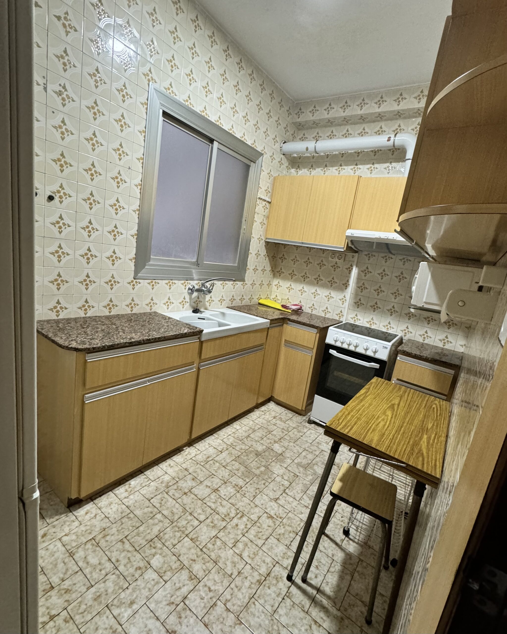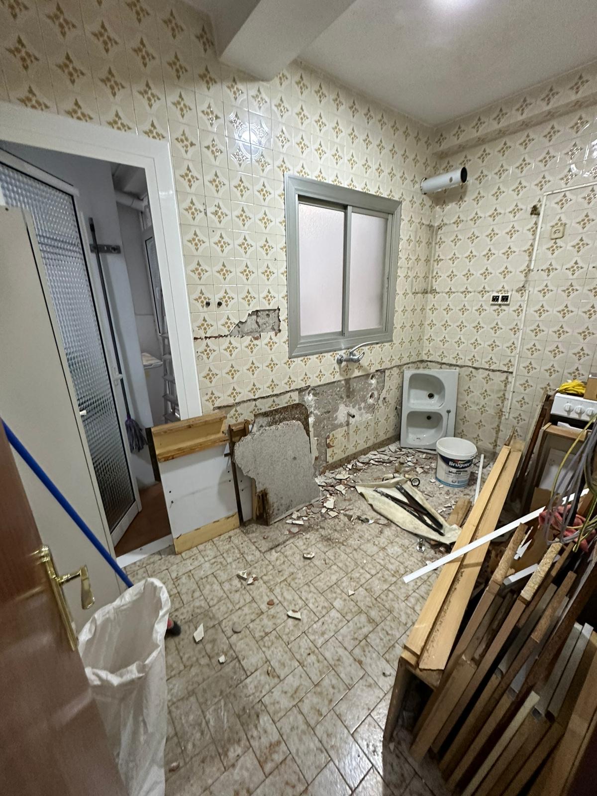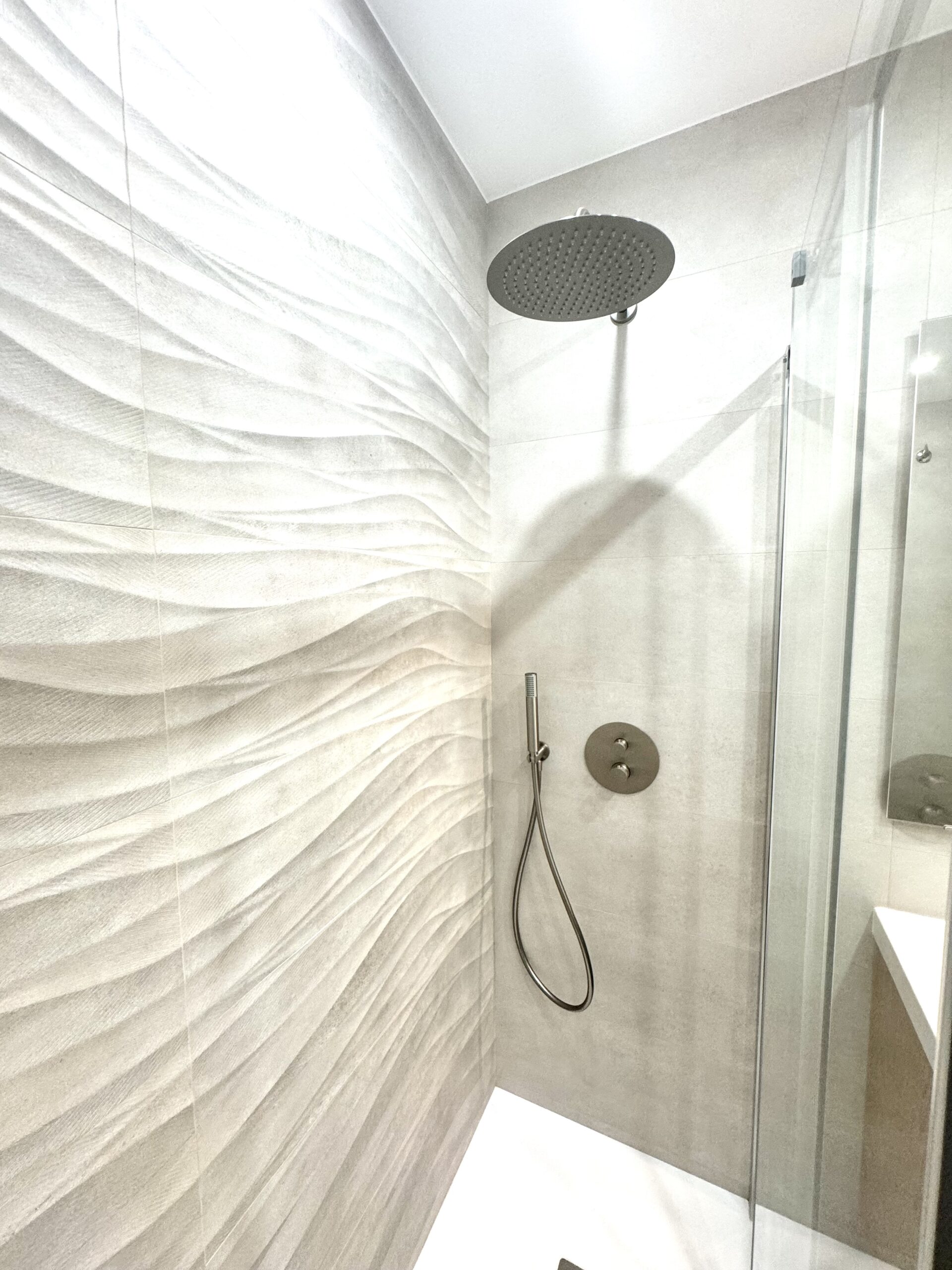 En la cocina, el proceso fue especialmente minucioso. Tras renovar por completo las instalaciones y colocar techos de Pladur, realizamos el cerramiento del antiguo paso al lavadero para optimizar la superficie de trabajo. El baño, por su parte, se planteó como un pequeño spa urbano. Instalamos un inodoro suspendido y una ducha con grifería empotrada, un detalle que no solo ahorra espacio, sino que eleva la categoría estética de la estancia.