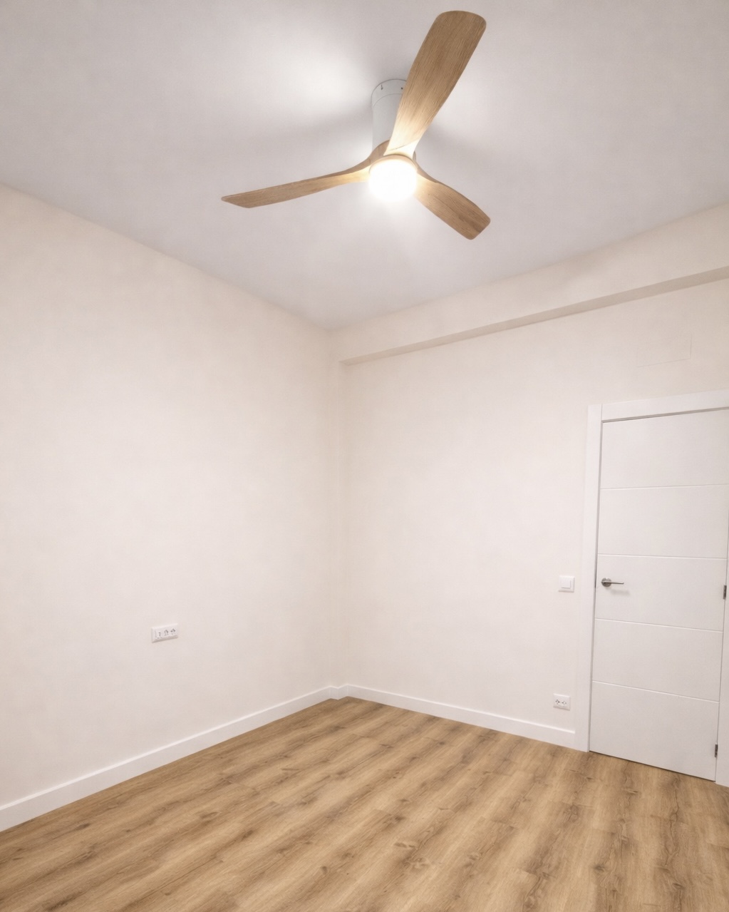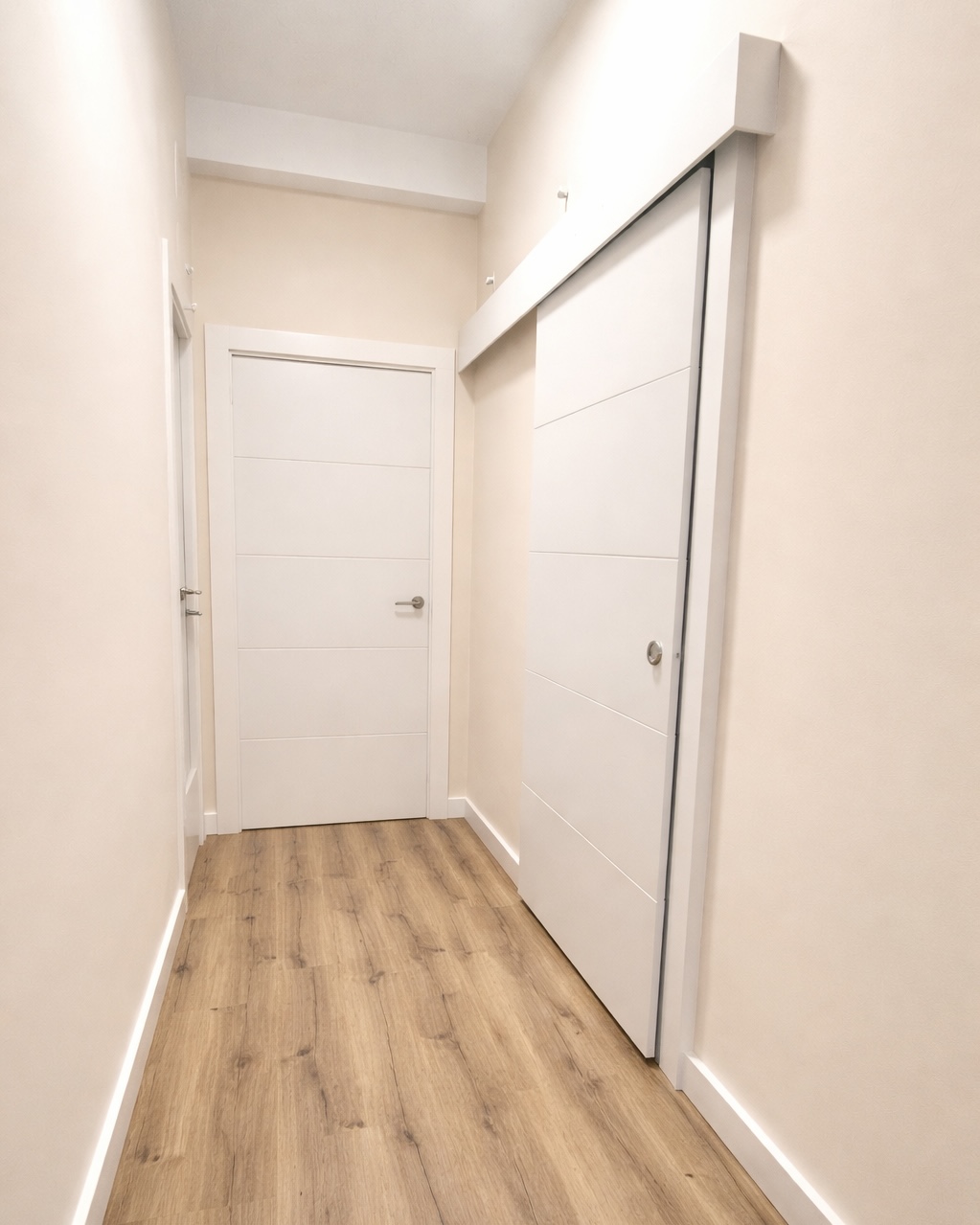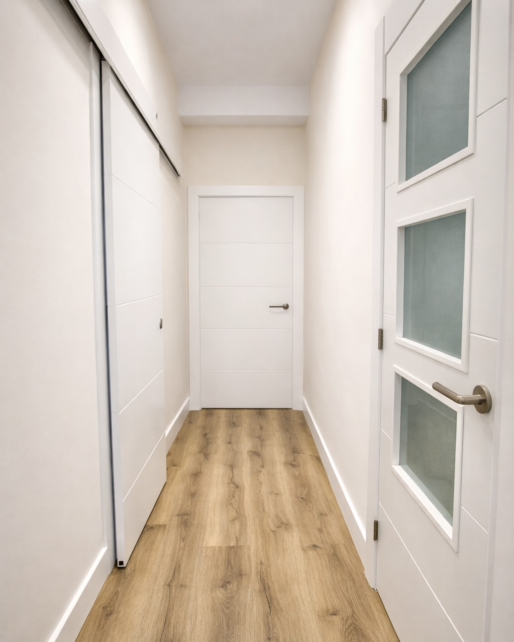 La transformación comenzó con el alisado integral de las paredes, un paso fundamental para que la luz natural de Barcelona rebotara con suavidad en los nuevos acabados. En las zonas comunes y dormitorios, optamos por instalar un suelo laminado Evolve de Finfloor AC6, cuya resistencia al tránsito es excepcional, complementándolo con puertas blancas lacadas que amplifican la sensación de limpieza visual.