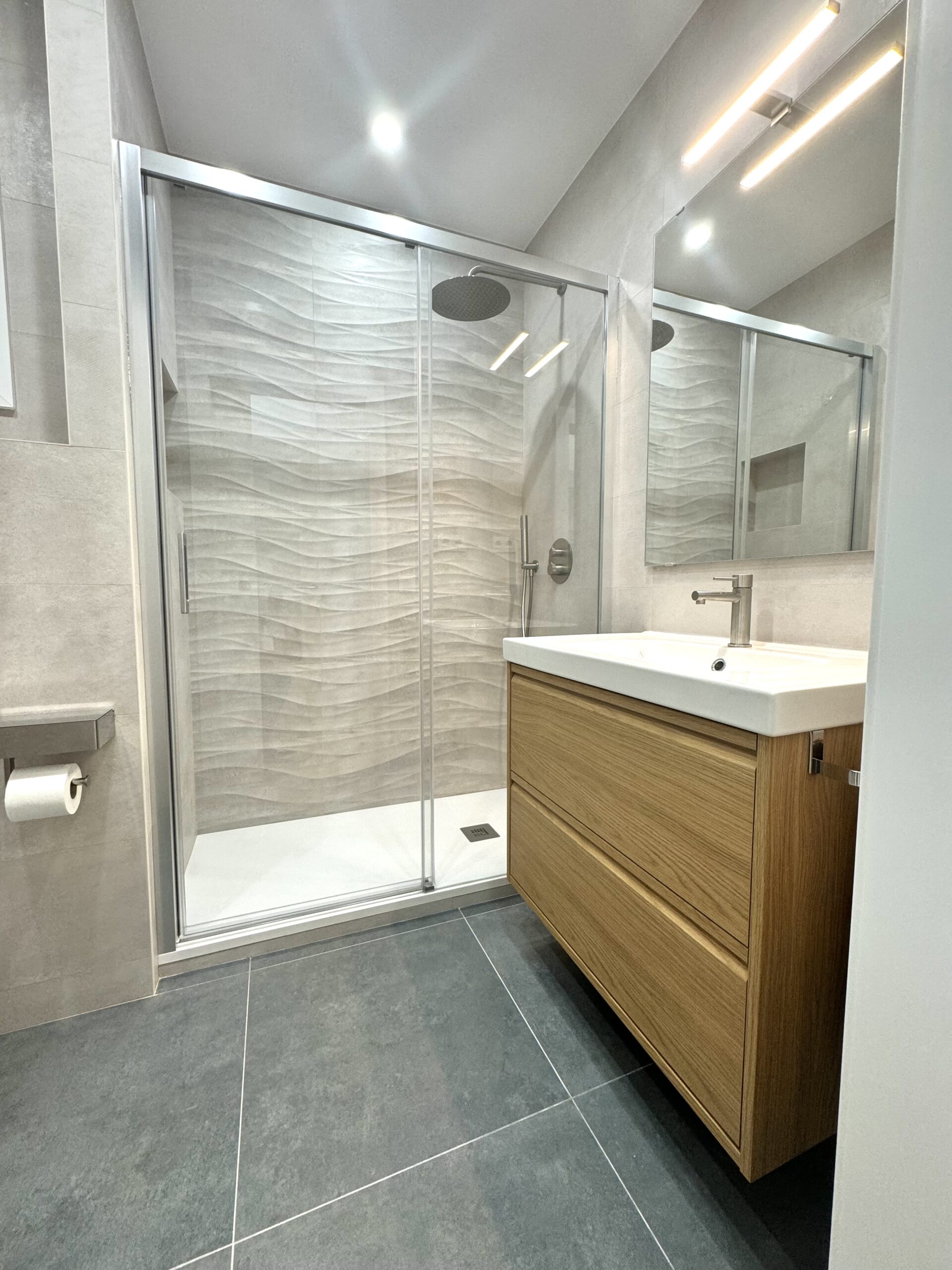 El resultado final es una vivienda que respira serenidad. La transición entre el pavimento gris porcelánico de las zonas húmedas (baño y cocina) y el laminado del resto de la casa es fluida y coherente. El baño, con su cerámica con relieve y mobiliario suspendido en madera, se siente amplio y ligero. Gracias a la aplicación de la pintura final y el cambio de ventanas de aluminio, Montse disfruta ahora de un aislamiento térmico y acústico superior, esencial para el confort en un entorno urbano como Barcelona.