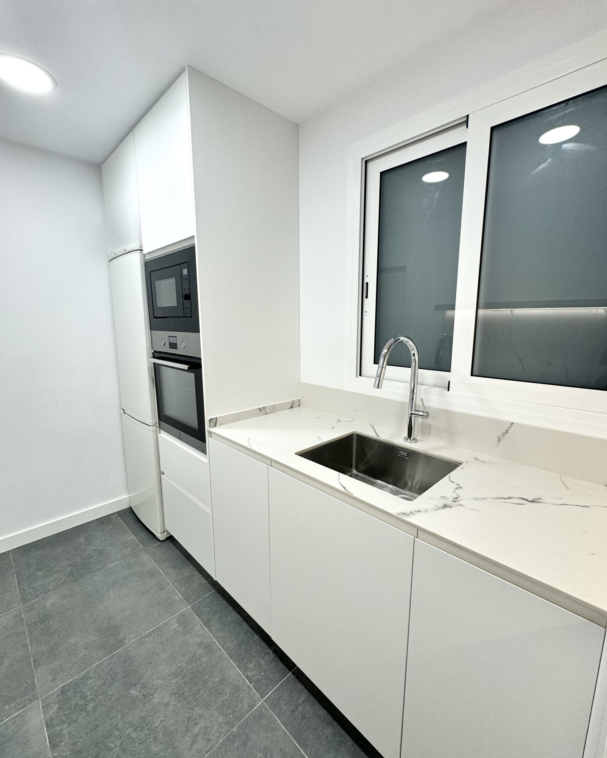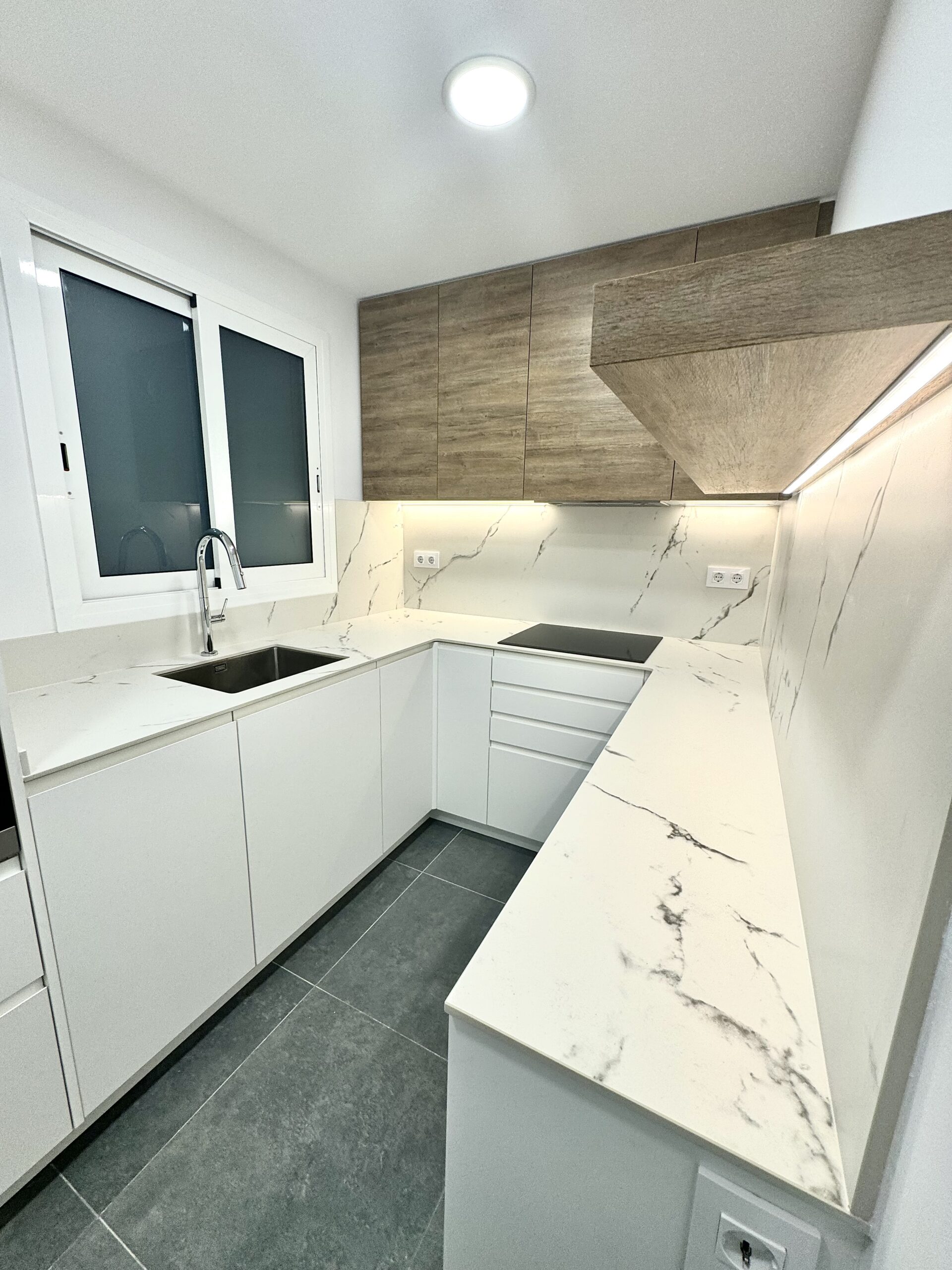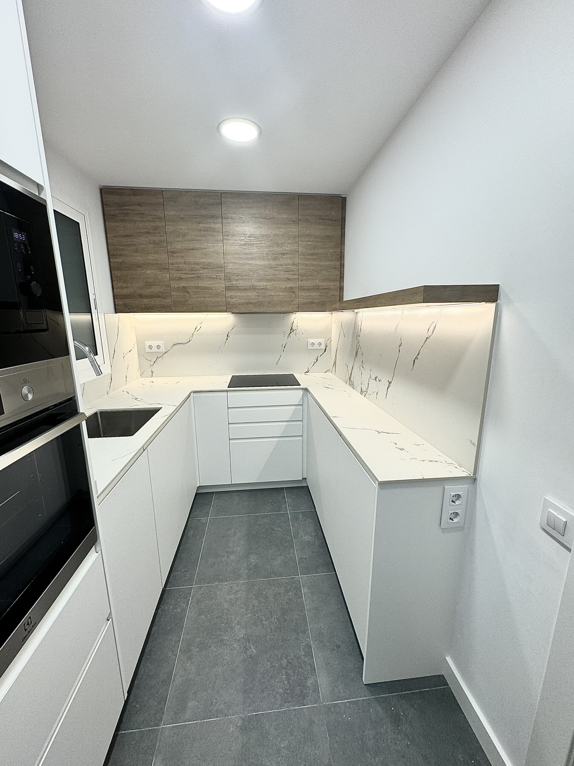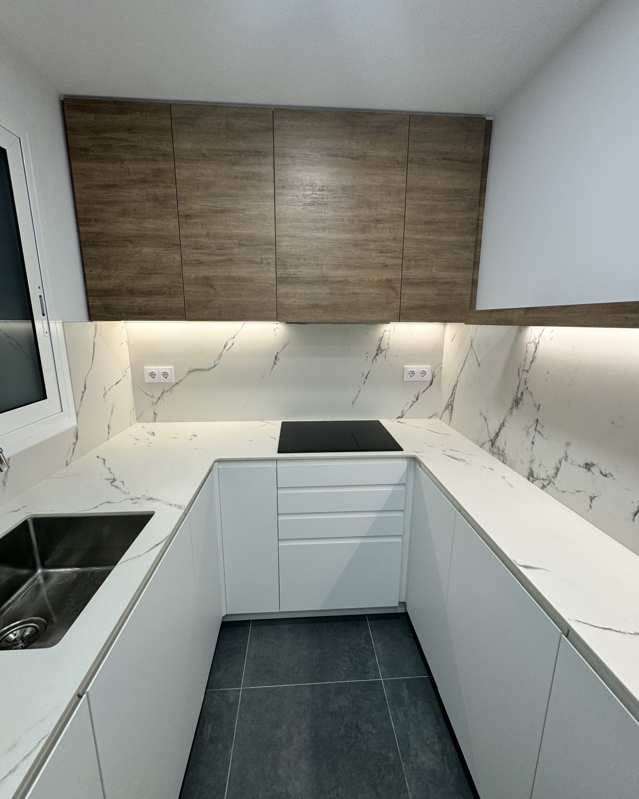 Lo que realmente define este proyecto en Sant Martí son los detalles de alta gama. En la cocina, los muebles a medida con uñero integrado en blanco mate se fusionan con zonas altas en madera, creando un equilibrio perfecto entre lo moderno y lo acogedor. La joya de la corona es la encimera y el frontal en Dekton Kairos, una superficie ultracompacta que imita el mármol con una resistencia insuperable.